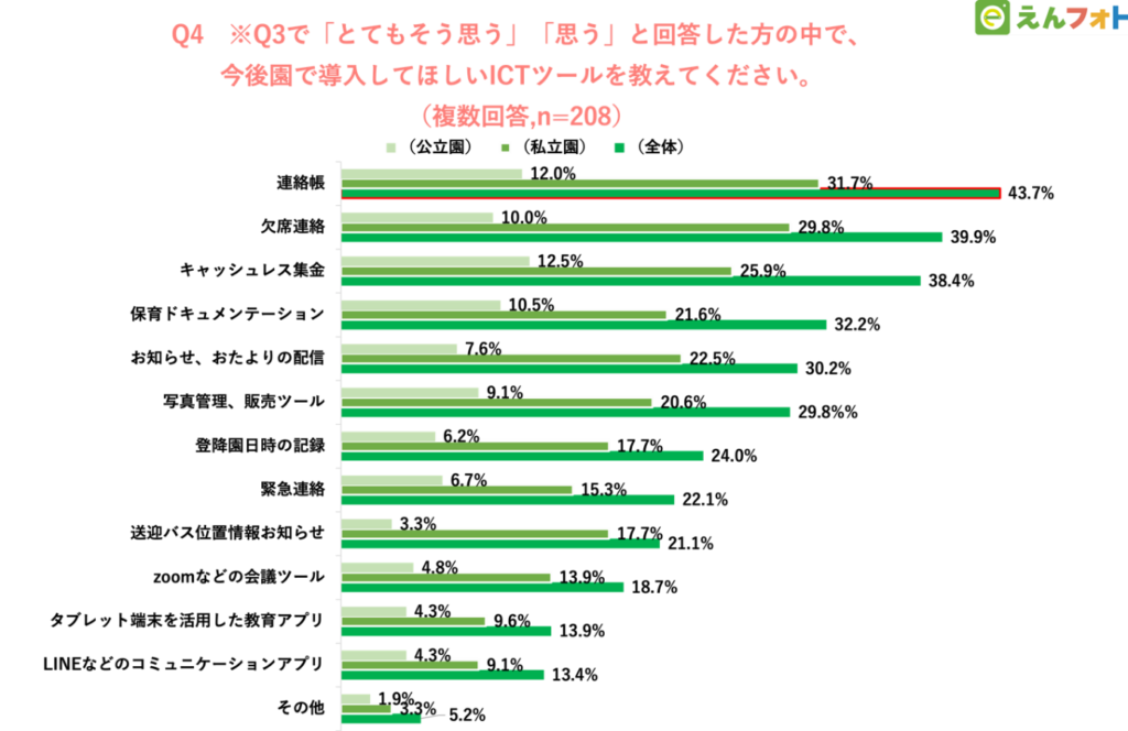 ・今後特に導入してほしいICTツールは「連絡帳」が1位に(43.7%)<結果4>