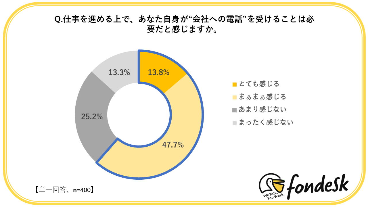 仕事を進める上で、あなた自身が“会社への電話”を受けることは必要だと感じるか質問したところ、6割以上(61.6%)が「必要だと感じる」と回答しました。