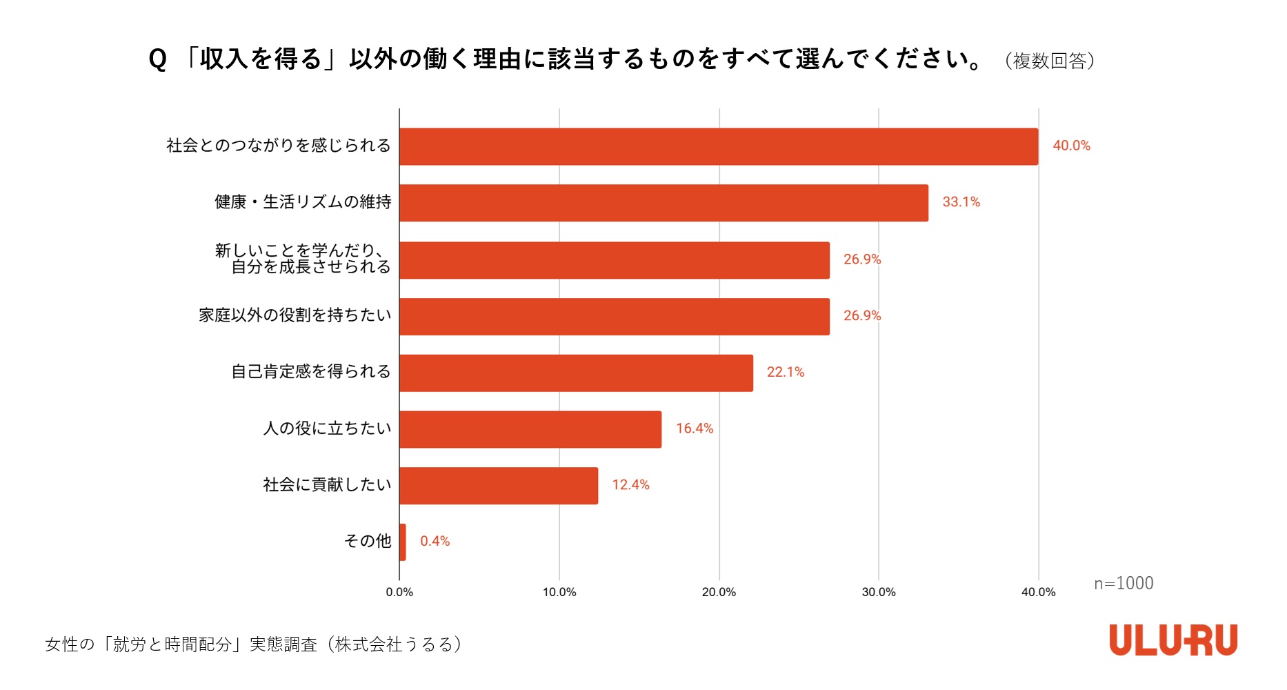 ・働く理由:収入以外の働く理由は、「社会とのつながりを感じられる」(40.0%)が最多。