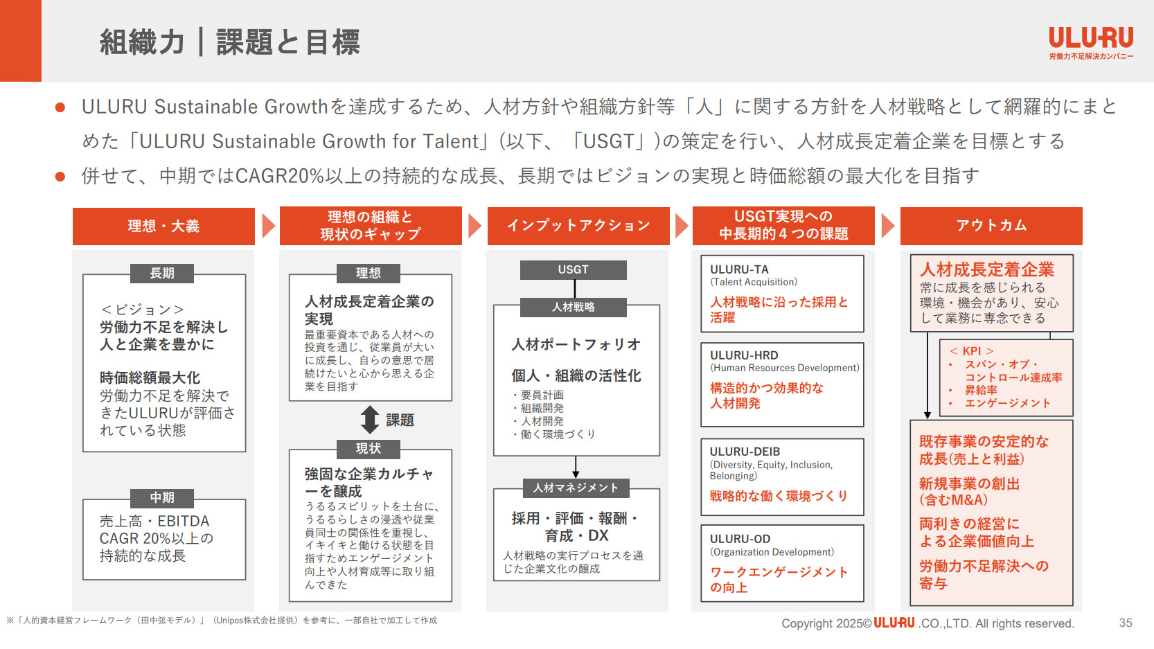 2025 年度版では特に代表の星をはじめとする経営陣のコミットメントや、経営戦略と現場での実践を結びつけるための人材戦略 「ULURU Sustainable Growth for Talent」の核となる課題を明示しています。これら4つの課題が有機的に連携することで、うるるが目指す「人材成長定着企業」の実現と、企業価値の最大化をより一層加速させてまいります。